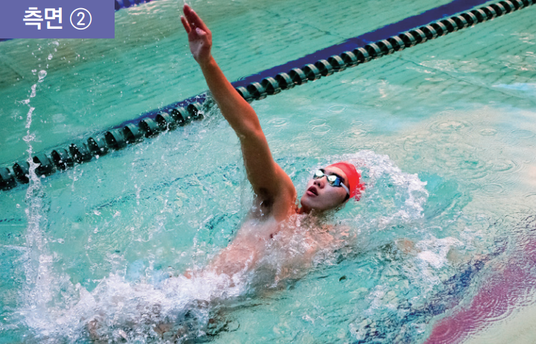 천장을 바라보며 물에 떠서 머리는 움직이지 않고, 머리부터 발끝까지 곧게 뻗은 선을 중심으로 양 어깨가 교차로 수면 위로 나오도록 롤링하며 스트로크해야 물의 저항을 줄일 수 있습니다.