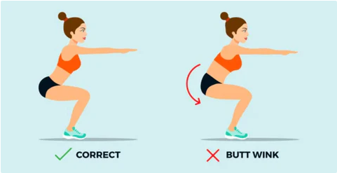 올바른 스쿼트 자세를 취할 때 가장 주의해야 할 자세는 요추말림 현상(butt wink)인데요. 의자에 오래 앉아있는 사무직에 종사하는 사람일수록 허리 근육이 약해지고 구부정해져 습관적으로 아래와 같은 butt wink 자세를 취하기 쉽습니다.